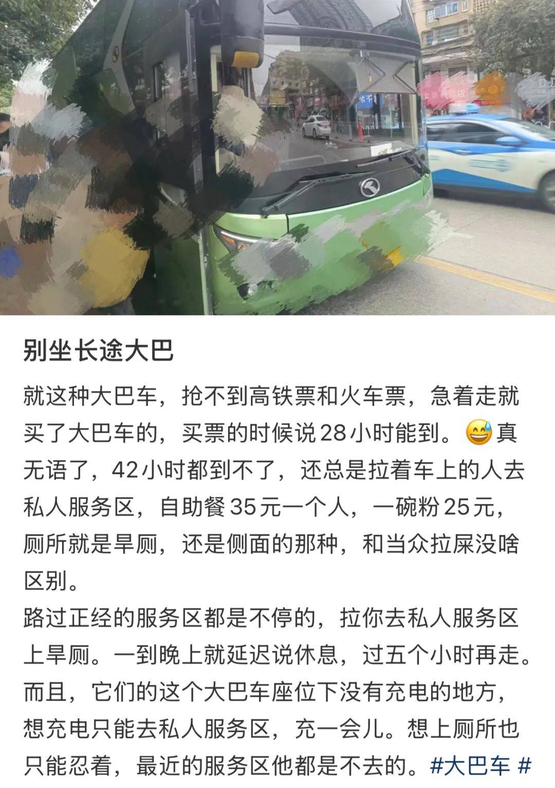 此外,由于长途大巴的特殊性,晕车、堵车、上厕所不方便也是乘客们日渐抱怨的缘由。