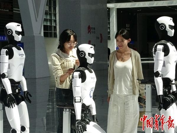9月20日,郑州航空港区中原国际会展中心,两位参观者饶有兴味地与机器人进行互动。中青报·中青网记者 李桂杰/摄