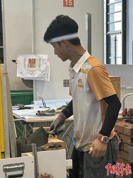 9月21日,郑州航空港区中原国际会展中心,陕西选手牟康明正在参加第三届全国技能大赛砌筑赛项。在比赛中,选手们需要运用砌刀、水平仪等工具,在限定时间内精准完成铺浆、放砖、造型、磨平等工序。中青报·中青网记者 李桂杰/摄