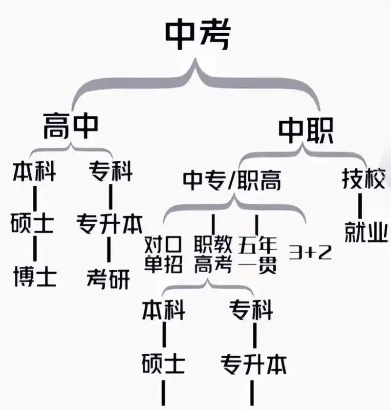 :学费低(部分公办中职免学费)、学制 3 年,可选择 “就业班” 直接上岗,或 “升学班” 通过 “职教高考”“对口升学” 考取高职(大专)。