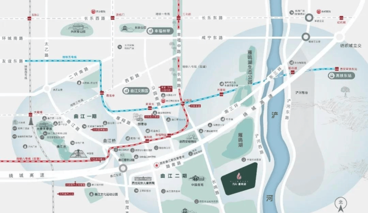 两纵:浐河西路、长鸣路;两横:南三环、绕城高速,无忧自驾出行;项目西侧杜陵邑南路已经开通,从雁鸣湖到曲江管委会约 2.2 公里,便捷通达曲。