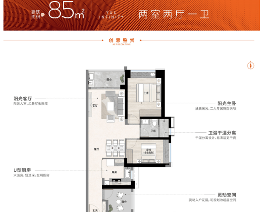 85-86㎡两房户型:作为项目的主力户型,设计更为舒适,南向朝向,能保证充足的采光和良好的通风效果,室内明亮通透,居住体验更佳。部分房源可俯瞰社区园林景观,视野开阔,闲暇时可以欣赏园林美景;户型布局合理,客厅宽敞明亮,卧室空间充足,能满足刚需家庭的日常居住需求,性价比突出,是刚需家庭的首选户型。