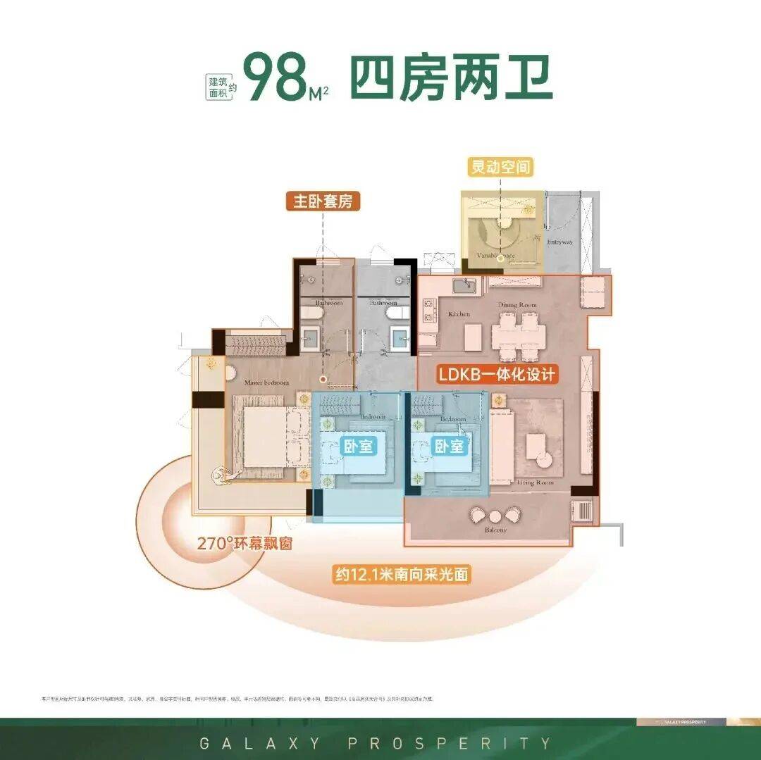 98㎡四房两厅两卫,是项目的热门爆款户型,也是刚需升级的首选户型,适合三口之家、四口之家,或者是想一步到位的刚需家庭,四房的配置,既能满足家人的居住需求,也能预留出书房、儿童房等空间,实用性非常强。