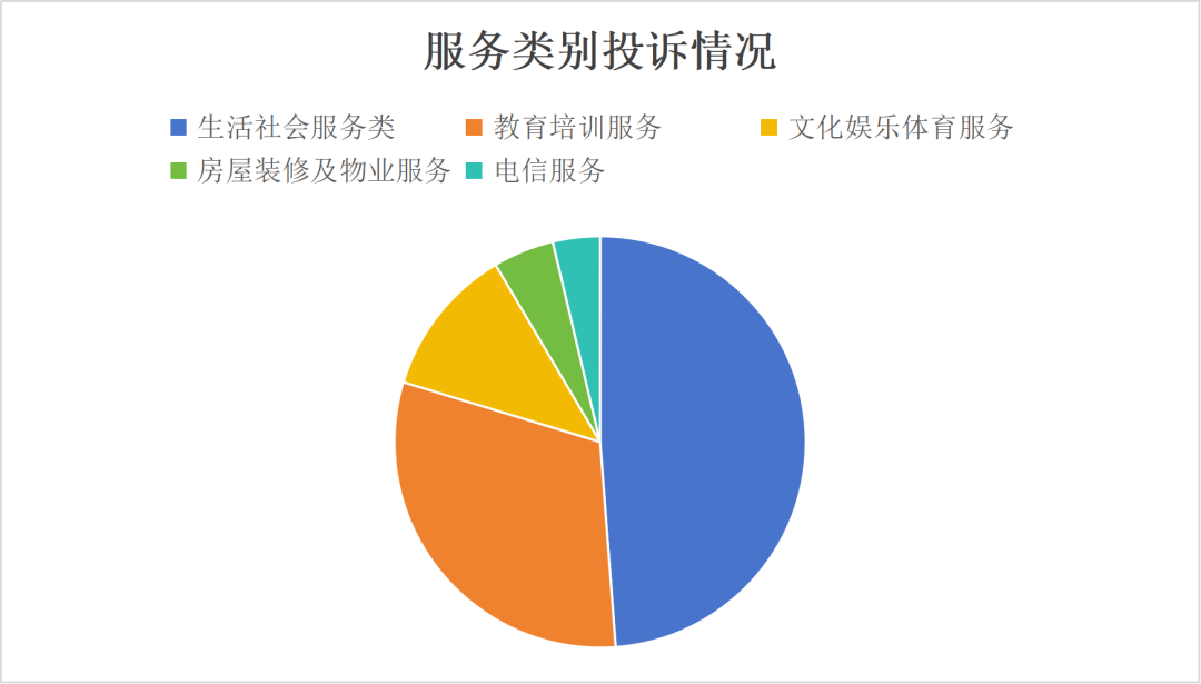 在服务类投诉中,教育培训服务400件,同比上升91.39%,主要反映学历教育、技能培训等退费纠纷等。其次是美容美发投诉211件,位居社会生活服务榜首,主要反映项目效果不佳,预付款退费纠纷等。此外,在二级分类中,各类别占比最大的分别是:社会服务(97件)、美容美发(211件)、健身服务(112件)合计占服务类投诉的56.35%,颇受关注。此外,其他商品和服务类投诉中,宠物及宠物用品相关投诉同比上升超100%。该类投诉集中反映出,受网络直播行业快速发展影响,不少消费者通过直播形式预定宠物,却在收货时发现宠物存在带病情况,且存在货不对板等问题,合法权益受到侵害。2025年服务类投诉排名前五的类别如下: