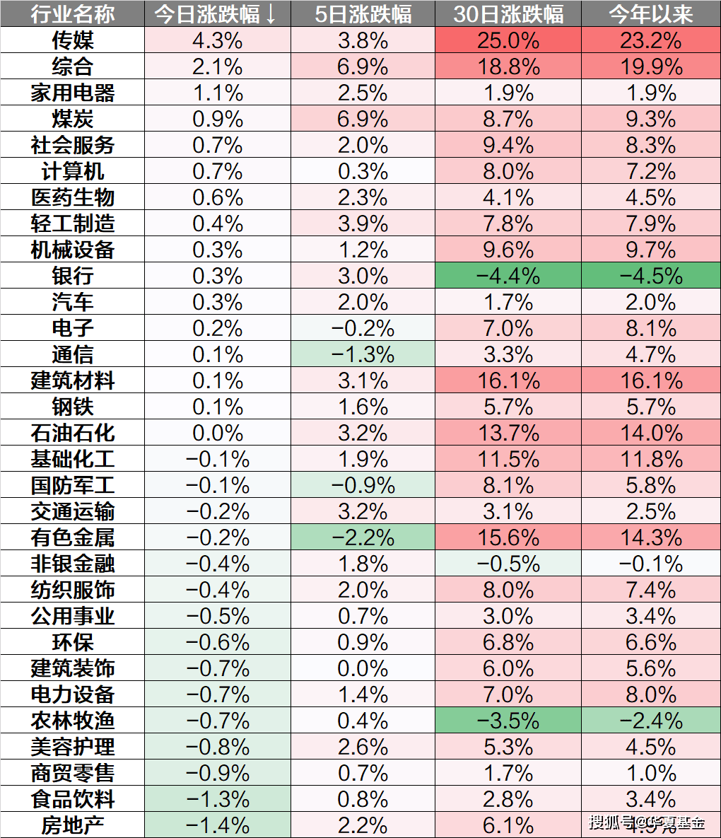 行业上看,传媒、综合、家用电器等板块上涨,房地产、食品饮料、商贸零售板块下跌。