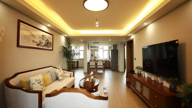 设施建设上,公寓尽显用心,规模宏大且细节到位。公寓总占地面积达46800平方米,建筑面积约26000平米,规划有各种标间、套间共400余间(套),每间房间都精心配备了满足老人日常生活所需的各类设施,包括独立卫生间、24小时热水、液晶彩电、简易小厨房、电磁炉、抽油烟机、冰箱、空调、洗衣机、衣柜、床头柜、双人床(可根据需求更换高级护理床或单人床)、写字桌、沙发、古木茶几等,全方位保障老人的居住舒适度。同时,纯净饮用水直接入户,全屋宽带覆盖,老人可随时上网与家人视频通话、浏览资讯;冬季采用地暖供暖,室温恒定舒适,彻底解决老人冬季取暖难题。