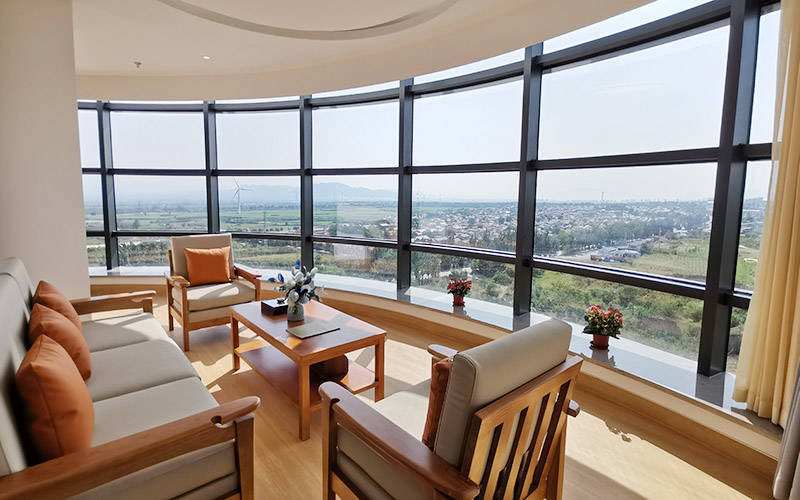 建筑面积达24000平米,规模宏大、配套完善,采用国际化医养建筑设计,充分融合日本和荷兰先进的医养与适老设计理念,突破传统医院和养老机构的冰冷氛围,营造一个如家般温暖、舒适的居住环境,缓解长者对医院、养老院的抵触情绪。院内配备智慧化适老家居系统,包含小米定制智能家居系统、智能监测系统、智能照护系统、智能安防系统等,让老人的生活更加安全、便捷,如智能监测系统可实时监测长者生命体征,异常情况及时报警,智能安防系统保障长者居住安全。同时注重无障碍适老细节设计,防眩晕灯光、防滑地板、适老扶手、助浴凳、电动护理床、紧急求助按钮、急救宝等设计,全方位满足老人日常生活需求、安全需求,细节之处尽显人文关怀。居室内设紧急求助按钮,公共区域设急救宝,可即时发送定位及警报;院内配备除颤仪、无创呼吸机、电动吸引器、心电监护仪、心电图机等医疗急救设备,可快速应对长者突发疾病;每床设医疗设备带(氧气管道和负压吸引装置),保障长者日常医疗护理需求。此外,院内设有1000余平米的专业康复中心,划分五大功能分区、三大康复系统,配置专业康复设备,为长者提供专业康复训练服务。