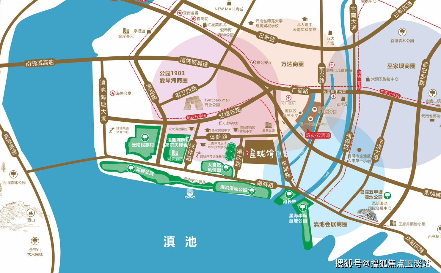 商业:公园1903爱琴海商圈、万达商圈、巫家坝商圈、滇池会展商圈环伺,无论衣食住行、购物、娱乐都能得到完美满足;